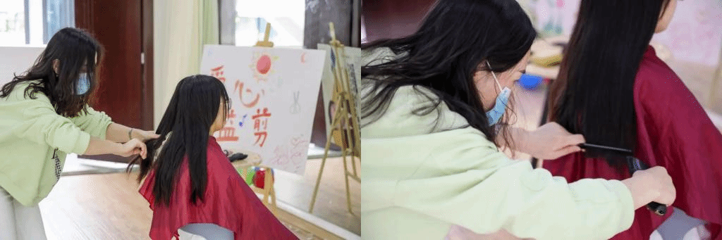 2020级电信工程及管理专业的刘荇杪同学一头乌黑的披肩长发,在邓秋菊老师的剪刀下变得错落有致、层次分明。刘荇杪同学本身也是本次活动的承办方——学校青年志愿者联合会的一员,她表示:“平时自己作为志愿者去帮助别人,今天站在被帮助者的视角所感受到的温暖,更加坚定了想发挥自己的力量去为更多的人做点什么的想法。我相信邓秋菊老师今天所散发出来的力量,也一定会感染到更多的人加入到我们志愿者的队伍中来。”