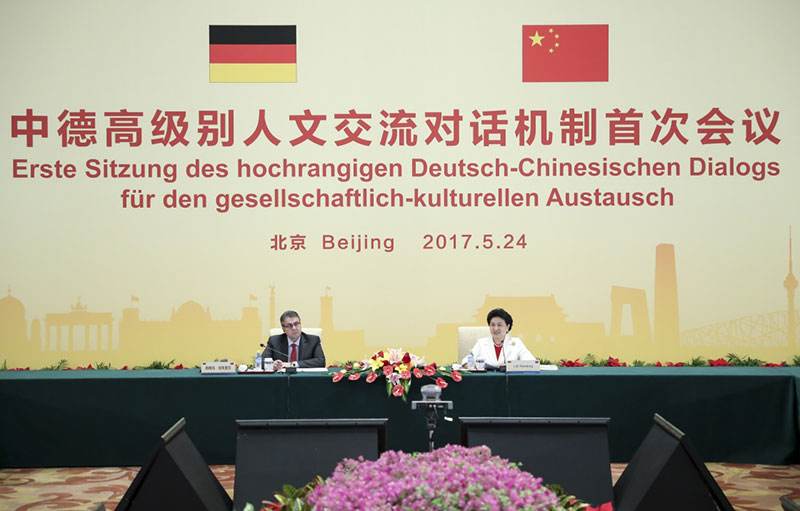 5月24日上午,中德高级别人文对话交流机制首次会议在北京钓鱼台宾馆召开,此次会议以“人文交流,合作共赢”为主题,机制双方主席——中国国务院副总理刘延东和德国副总理兼外长加布里尔出席会议。中国国家主席习近平向会议致贺信。