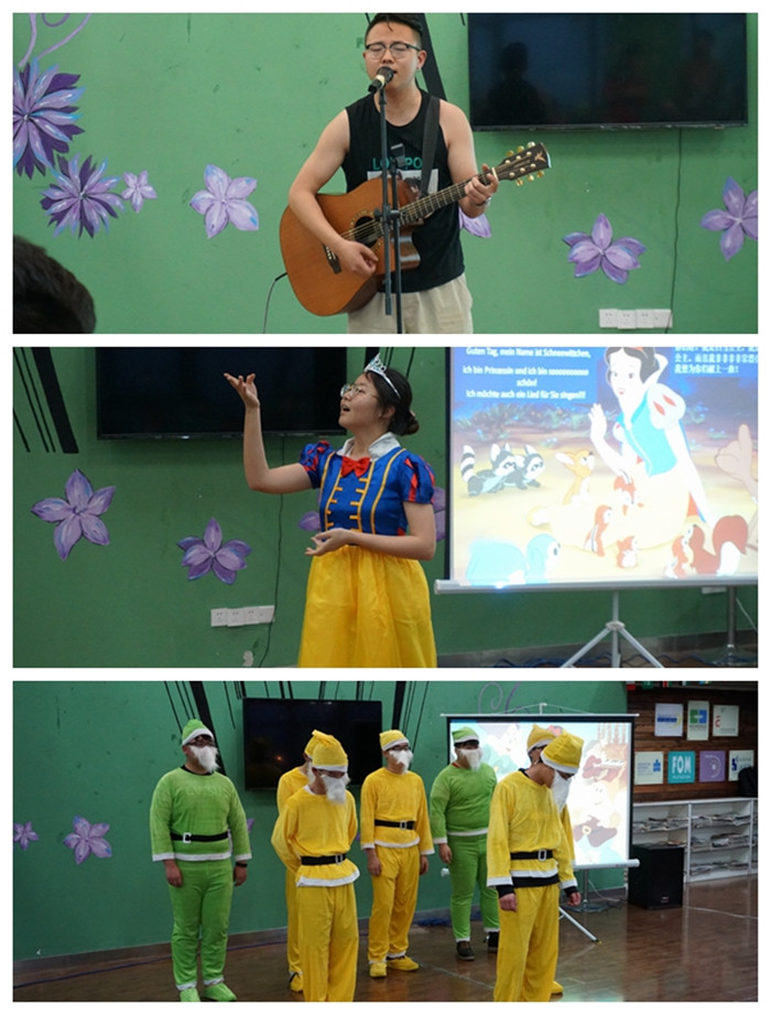 晚7时整,家长陆续来到了中德书屋,家长们纷纷入座,孩子们跃跃欲试,随着主持人的报幕,一个又一个精彩纷争的节目呈现在家长眼前。学生会同学集体献上的啦啦操表演振奋人心,朱一楠的《父亲写的散文诗》情感真挚催人泪下。当朱一楠同学的吉他弦在掌声中停止颤动时,便是德语班同学的表演时刻了。