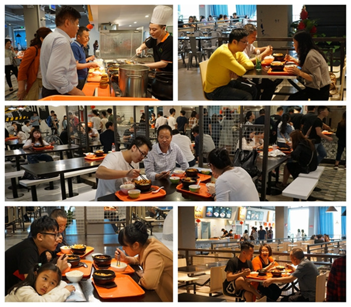 中午时分,众人移步A区食堂二楼享受亲子时光。亲眼见证了孩子的成长后,很多家长一下子拥有了更多的热情,他们和孩子坐在一起幸福地享用着学校为他们准备的美味大餐。当然也有热情的家长们邀请老师们就座,跟他们一起享用午餐,同时也趁这个机会在饭桌上沟通,尽可能地了解学校的一些情况。