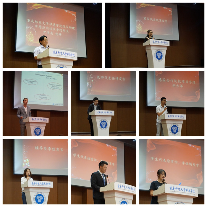 9时整,大会正式开始。在家长热烈的掌声中,中德应用技术学尹浩亮院长、宣传新闻中心苏述庚主任、学生处陈帅副处长、中德应用技术学院综合办公室主任廖梅梅老师、中德应用技术学院双语教研室主任任博老师、中德应用技术学院德语教研室侯宇晶老师、中德应用技术学院外教Timo老师、中德应用技术学院学生工作办公室主任武强义老师及中德应用技术学院全体辅导员老师相继起立致意。