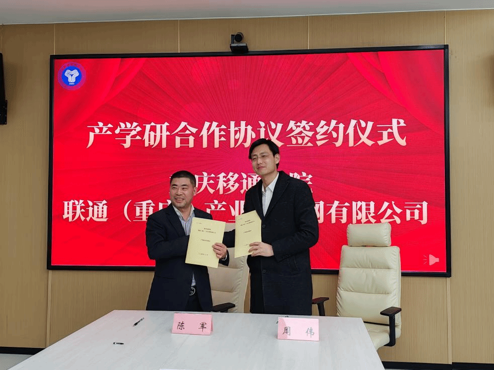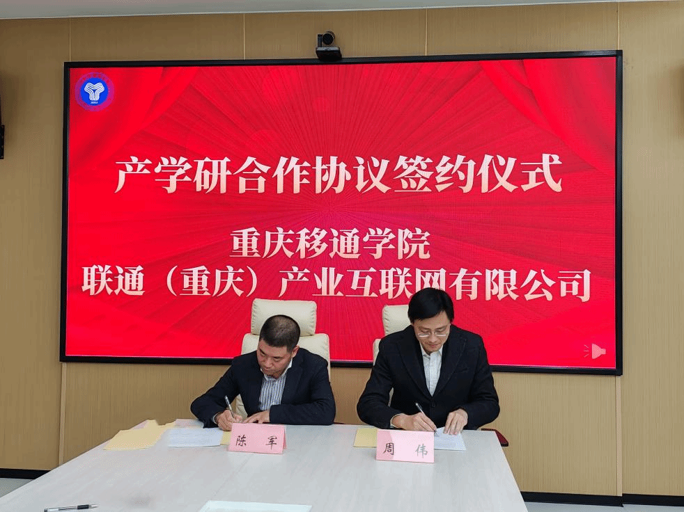 产教融合交流环节结束后,重庆移通学院常务副校长周伟与联通(重庆)产业互联网有限公司副总经理陈军作为双方代表进行了产学研合作协议签约,正式确立合作伙伴关系,双方将在教育、科技、人才等多领域展开深度合作,共同推动产教融合的开展。