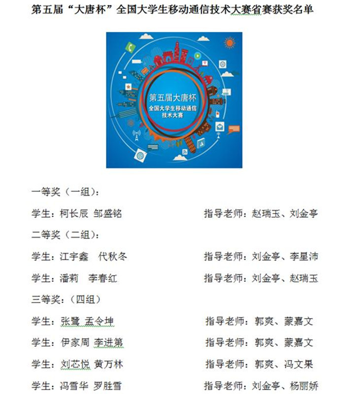 近日,通信与物联网工程学院学生在老师们的悉心指导下,获得了第五届“大唐杯”移动通信技术大赛重庆赛区一等奖2项、二等奖4项、三等奖8项的好成绩!
