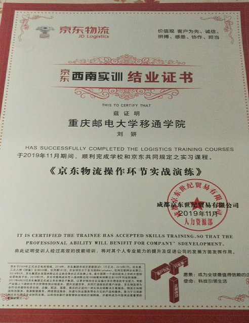 其中程思维、刘妍、杨中翠、张旭四位同学更是在双11大促中表现突出,获得了“每日之星”的称号;刘妍、程思维两位同学获得“卓越实习生”称号;方英、杨中翠、张旭三位同学获得“优秀实习生”称号。这一份份沉甸甸的奖状,不仅代表了物流管理方向学生的实力,也代表着淬炼商学院的领导和老师的付出有了一点点的回报。“纸上得来终觉浅,绝知此事要躬行。第一次有机会到京东参观,开了眼界,很多理论知识终于落地的感觉,以后是否可以更早的接触这类企业。”回忆起这次实习经历,程思维同学引用简单的诗句做了一次完美的总结。