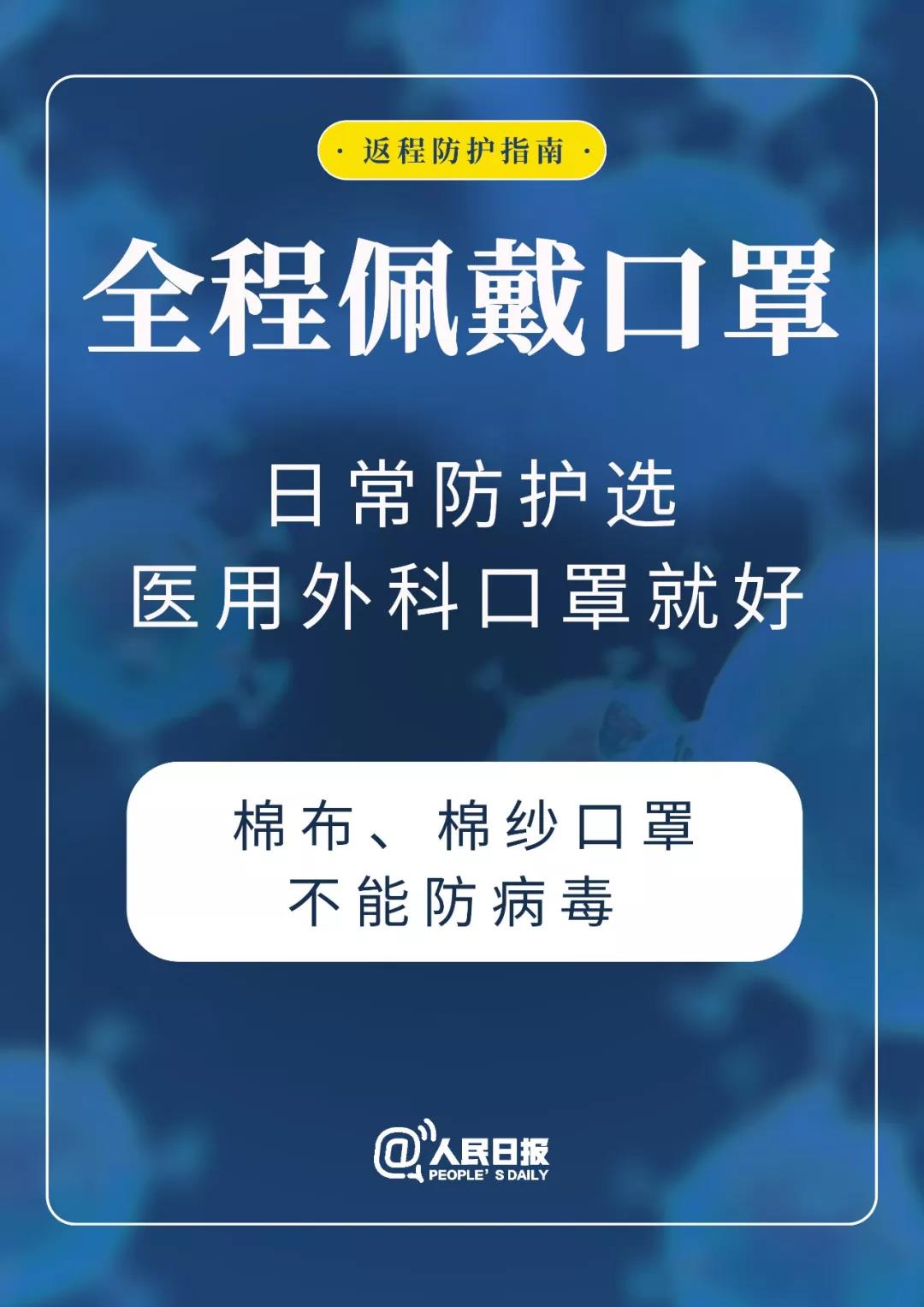 不管是坐飞机、火车还是自驾车,以及到公共场所和乘坐公共交通工具时,全程佩戴医用外科口罩或N95口罩。