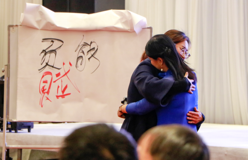 为了更好的让大家感悟拥抱的力量,在李星彤导师的示范和引导下,大家学习并体验了“眼到、手到、心到”的幸福式拥抱。郭淼老师被邀请到前台与导师进行了一次1分钟的拥抱,她分享道:“确实已经很久没有和身边的人拥抱了,刚才和老师拥抱,让我感受到人与人之间最纯粹的情感,给人一种温暖的力量。”