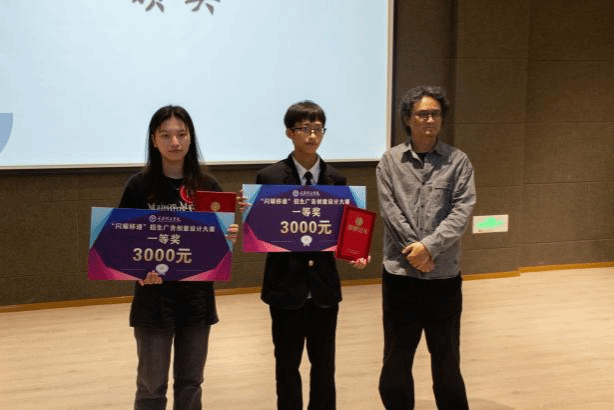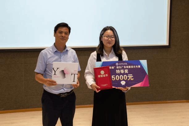 嘉宾点评结束后,主持人宣布获奖名单。最终,“伍乾”队凭借整套移通礼盒加情书的方式获得评委们的青睐,摘得第五届“闪耀移通”招生广告创意设计大赛特等奖,“没赢是我的不队、麦田里的守望者”斩获一等奖,“完满世界”等4支队伍获得二等奖,“大佬求针对”等6支队伍获得三等奖,“移影闪耀队”等7支队伍分别获得优秀奖。同时为优秀指导老师颁发奖励。