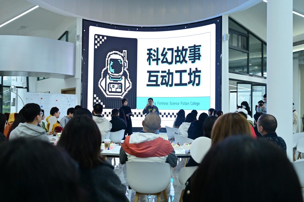 在科幻故事互动工坊活动中,领航员阿缺和段子期将现场同学分成四组,分别负责世界背景、人物设定、规则体系和主线故事的制定,经由现场讨论和阐释,彼此激发,共同完成故事创作。活动期间同学们利用天马行空的想象力,通过游戏分组等方式在探讨中搭建故事架构,充实故事剧情,完善起承转合,构建出一个科幻世界。