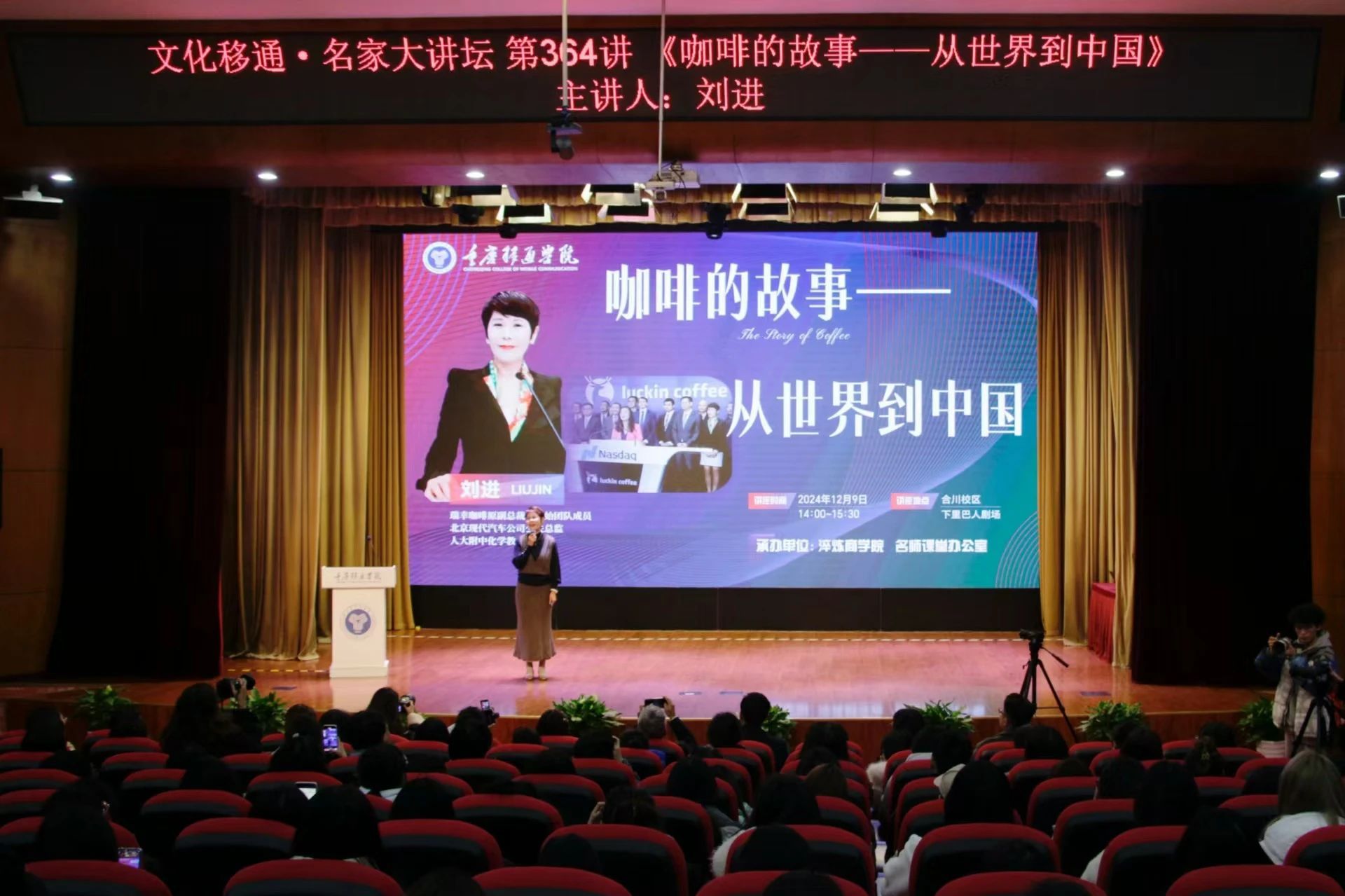 12月9日下午,文化移通·名师大讲坛第364讲在合川校区下里巴人剧场举行。带着对咖啡的深厚情感和丰富经验,瑞幸咖啡原副总裁、核心创始团队成员,北京现代汽车公司公关总监,人大附中高级教师刘进走进重庆移通学院,为合川校区师生带来题为《咖啡的故事——从世界到中国》的精彩讲座,深度剖析咖啡背后故事。集团高级副总裁张亮、重庆移通学院常务副校长周伟现场观看。校长助理张平主持讲座。
