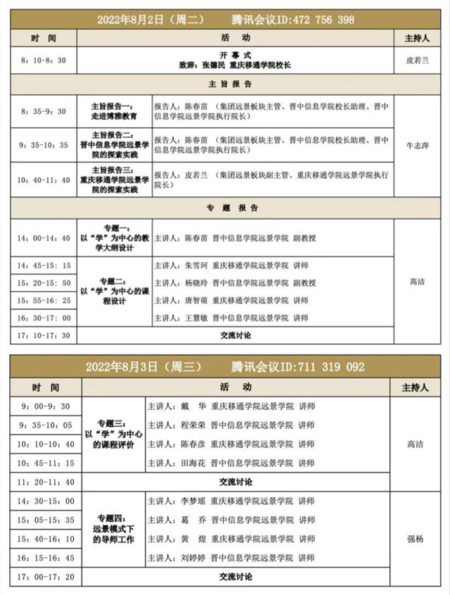 春生夏长,深耕十载,2022年是写进集团远景教育发展史最为承前启后、继往开来的一年:这一年,我们回顾渝、晋两所远景栉风沐雨、十年奋楫之征程;同时庆祝两所全新的远景学院于綦江之畔、泰山之麓扬帆启航。为使三校四区全体教职员工能在新的起点上踔厉奋发,赓续前行,中国新商科大学集团远景板块于8月2日-4日组织召开团队赋能云端培训会。本次培训历时3天,由主旨报告、专题报告、专题访谈、圆桌讨论构成,内容围绕理念篇、教学篇、导师篇、学生篇、管理篇共五大模块十四个专题展开。三校四区远景学院全体教职员工全程参会。