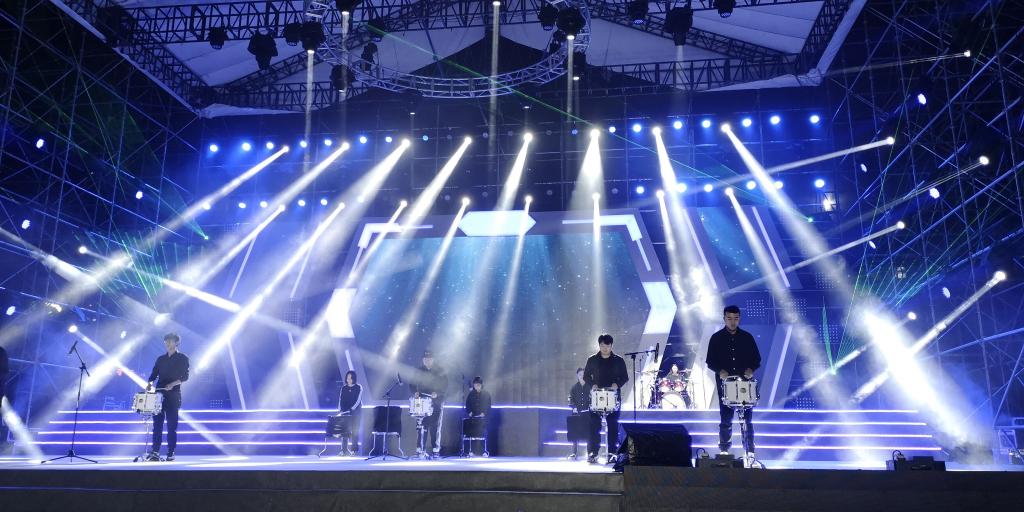 光影交织下,多鼓齐奏,校乐团娴熟的演奏技艺和乐器之间的完美配合相得益彰。动感的旋律、密集的鼓点、富有力量感的舞蹈和极具科技感的舞台一下将现场观众拉入遥远的壹亿光年之外。