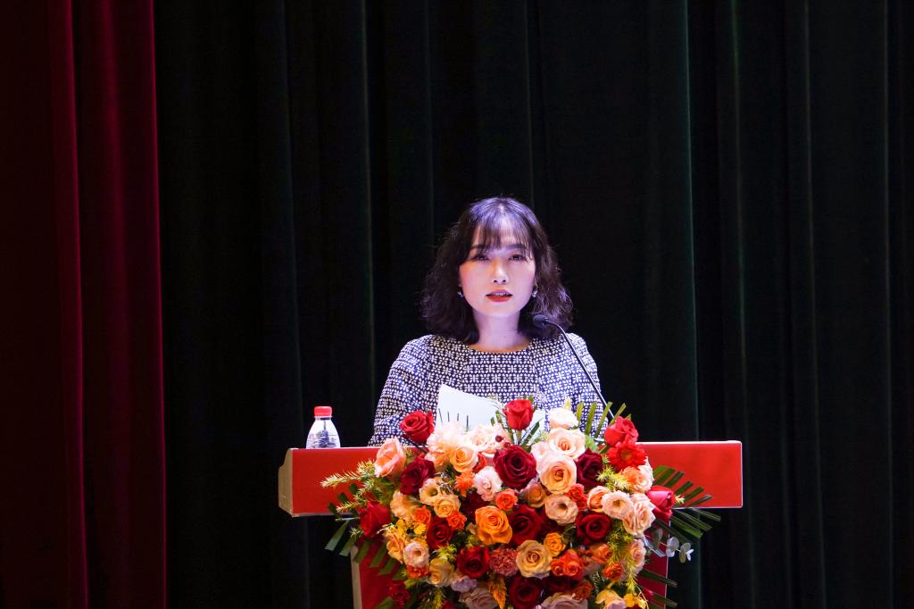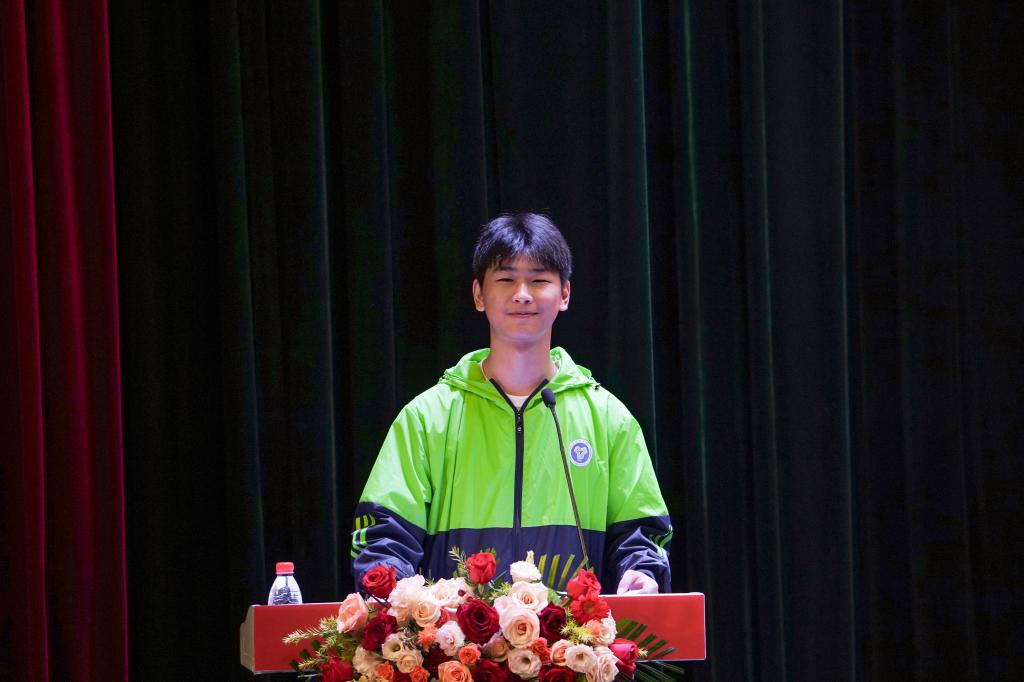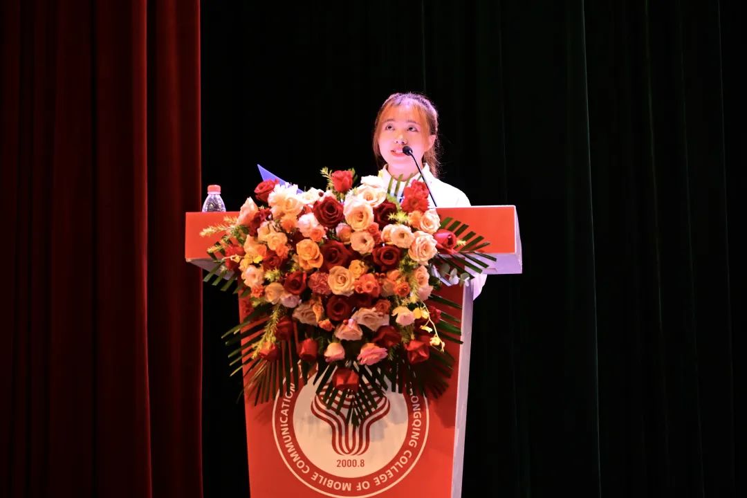 艺术传媒学院2019级广播电视编导专业邹雅兰作为在校生代表发言。她谈到,学校每年上千场活动、上百场讲座、数十场全国性赛事活动都只为给移通学子打造一个更为丰富全面的发展空间,要用一腔热忱在移通打造属于自己的天地。同时,移通提供了无限平台:商科教育在项目讨论与案例分析中提升管理能力;通识教育在古今中外的理念与故事中感受到丰富的人文精神;专业教育在知识学习与专业实训中夯实技能。完满教育在欢乐与趣味中充实自我、锻造完满人生。