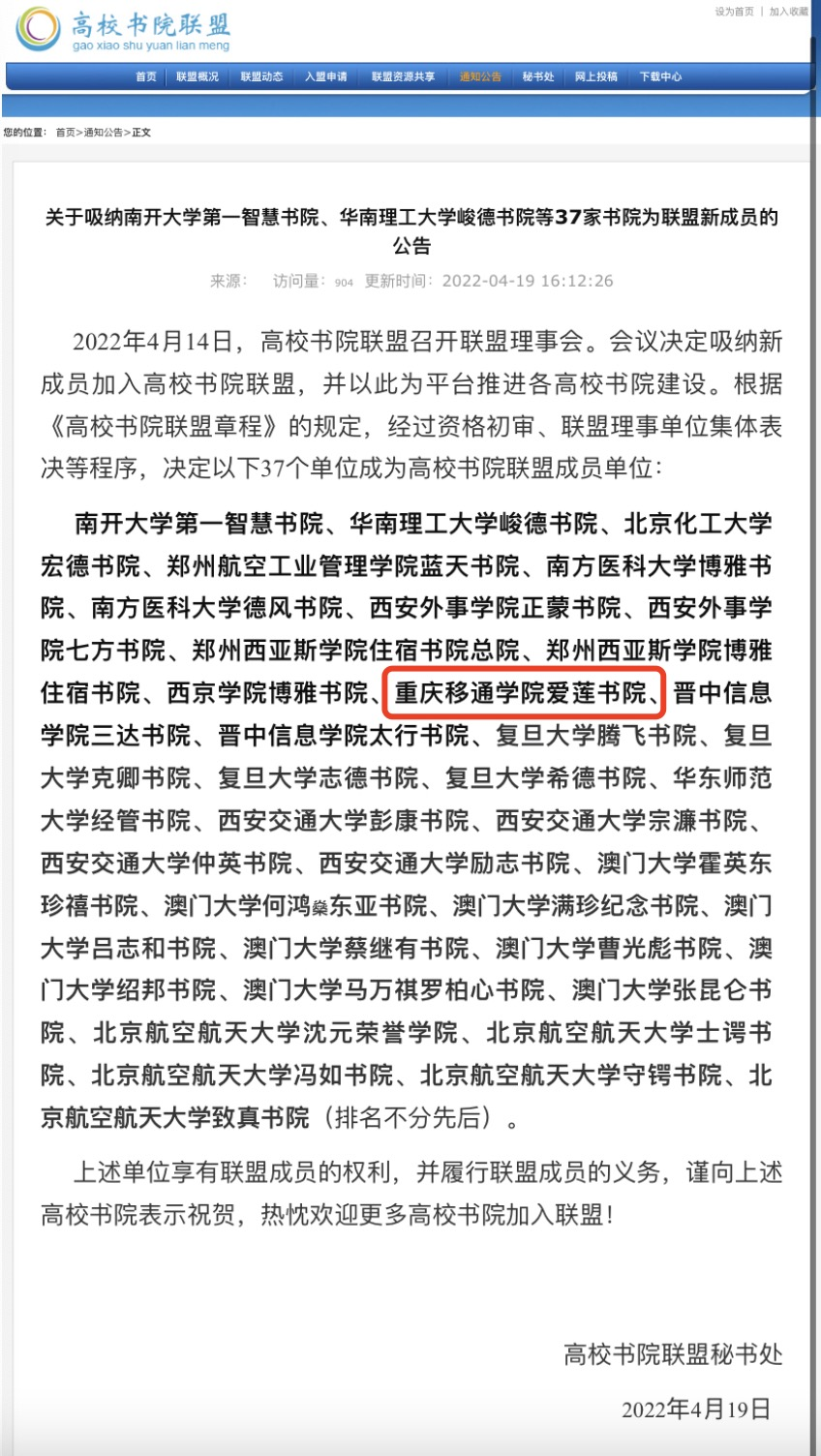 近日,自高校书院联盟发布《关于2022年高校书院联盟吸纳新成员的公告》以来,我校爱莲书院积极申报入盟,经过材料筹备、线上答辩、专家问答等环节,与来自全国20余家单位同台展示。答辩完毕后,书院联盟理事会常务理事单位通过讨论和投票产生高校书院联盟入选成员单位,并于4月19日公示,重庆移通学院爱莲书院正式成为全国高校书院联盟成员单位。值此“完满教育十周年”“书院建设五周年”之际,加入全国高校书院联盟,是我校书院制提升内涵建设,加大对外交流合作的重要一步。