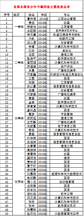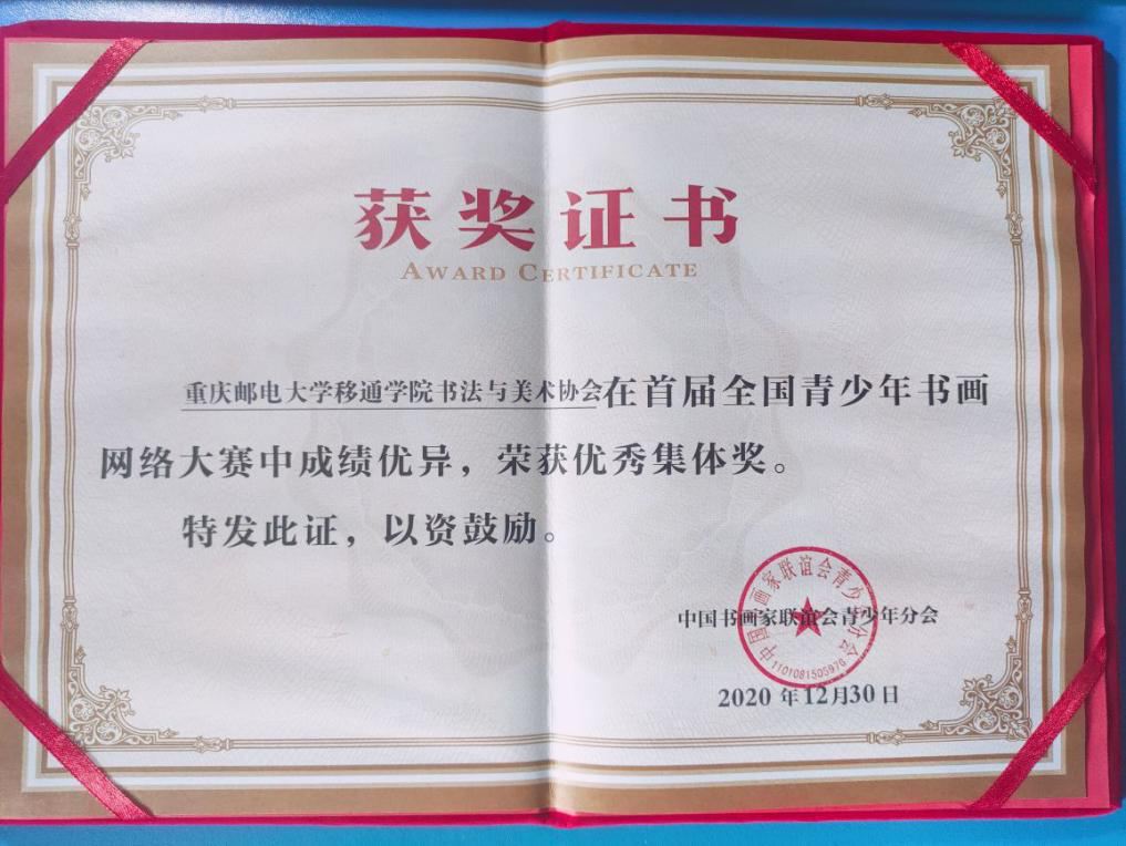 近日,由中国书画家联谊会指导的、中国书画家联谊会青少年分会主办的首届全国青少年书画网络大赛公布获奖名单。我校学子秉承着“不精不诚,不能动人”的精神,在本次比赛中表现优异,提交高校组作品90余幅,获奖作品达50幅,创书法与美术协会历史获奖数新高。经统计获一等奖5名,二等奖13名,三等奖15名,优秀奖17名,获奖人数占总参与人数的60%,我校书法与美术协会也是重庆市唯一一个斩获集体奖荣誉的高校。