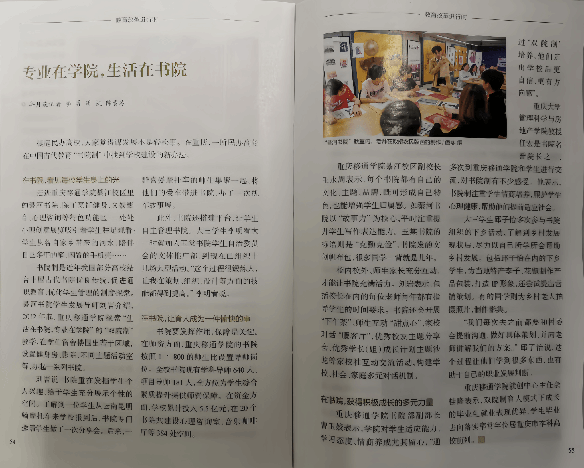近日,半月谈以《专业在学院,生活在书院》为题,报道我校书院制建设。我校作为“中国民办大学第一”“中国大学素质教育排头兵”,主张“生活在书院+专业在学院”的双院制人才培养模式,通过双院制促进学生全面发展,把学生培养成具有信息产业专业技术背景的高情商经营管理人才。