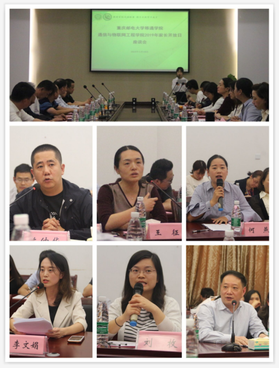 在了解了学校的硬件设施和学习环境之后,家长们还希望了解学校的教学模式、学院的师资力量、学生的就业前景等内容。为此,通信与物联网工程学院特地在行政楼107会议室举办了家长座谈会。出席本次座谈会的有重庆邮电大学移通学院副校长王征老师、重庆邮电大学移通学院校长助理兼教务处处长刘枚老师、双体系卓越人才教育基地主任陈仲华老师、通信与物联网工程学院副院长李文娟副教授、通信与物联网工程学院副院长唐林建副教授、通信与物联网工程学院副院长何燕老师、以及通信与物联网工程学院各教研室主任和教师代表们。