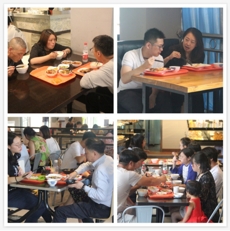 时至午时,在经过一上午对学校、学院的了解后,家长们与孩子在A区食堂享用了学校免费提供的午餐。家长们来到食堂与学生一起用餐,对学生在学校的饮食状况有了更加直观的了解,家长们都表示食堂的饭菜十分的多样化、搭配合理、营养健康,“比自己以前上学的食堂好多了”。就餐期间,家长们与孩子进行了热切的交流,关心其在学校的生活学习状况,对自己一个月甚至一年才见一次面的孩子从生活到学习方面都再三进行了叮嘱,场面十分温馨。