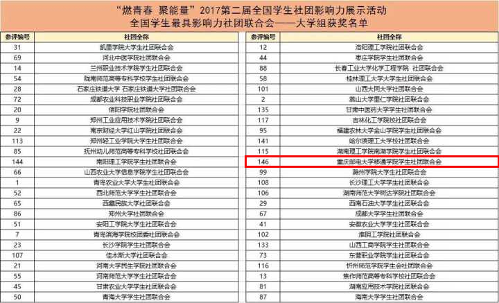 近日,我校学生社团联合会在由共青团中央网络影视中心、未来网共同主办的“燃青春,聚能量”2017第二届全国学生社团影响力展示活动中,以丰富全面的申报材料为基础,在全校师生齐心协力的推举下,一举荣获“全国最具影响力”学生社团联合会荣誉称号,也是重庆市各高校中唯一获此殊荣的学生社团联合会。