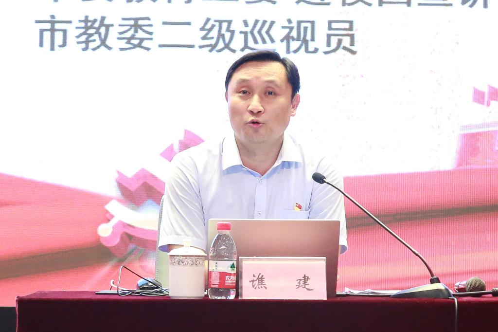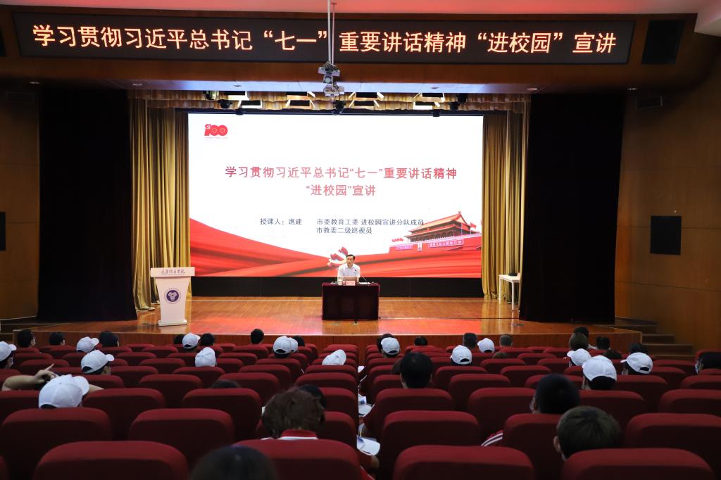 为深入学习贯彻习近平总书记“七一”重要讲话精神,推动党史学习教育深入开展,9月14日,市委教育工委学习贯彻习近平总书记“七一”重要讲话精神“进校园”宣讲分队队员、市教委二级巡视员谯建同志走进我校为师生作学习贯彻习近平总书记“七一”重要讲话精神进校园宣讲报告。校党委书记苏开荣主持,在校校领导、各基层党组织负责人、各部门和二级学院负责人以及师生代表等共计200余人参加了会议。