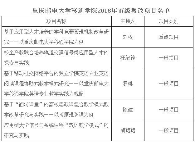 近日,重庆市教委下发了《重庆市教育委员会关于公布2016年度高等教育教学改革研究立项项目名单的通知》(渝教高发〔2016〕49号),我校推荐的5个项目全部获批立项,其中,重点项目1项,一般项目4项。