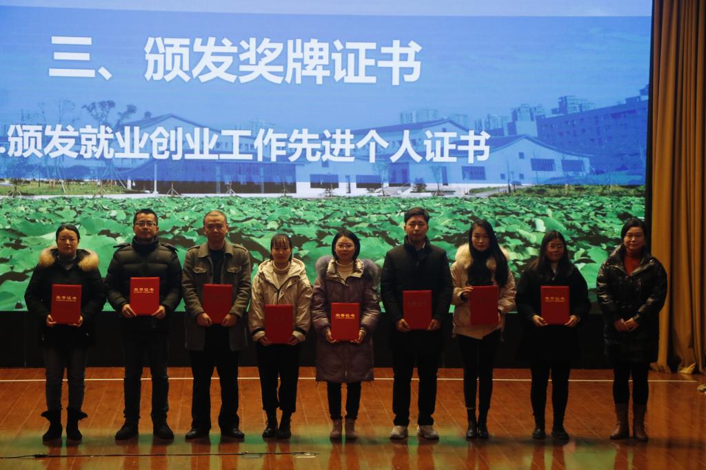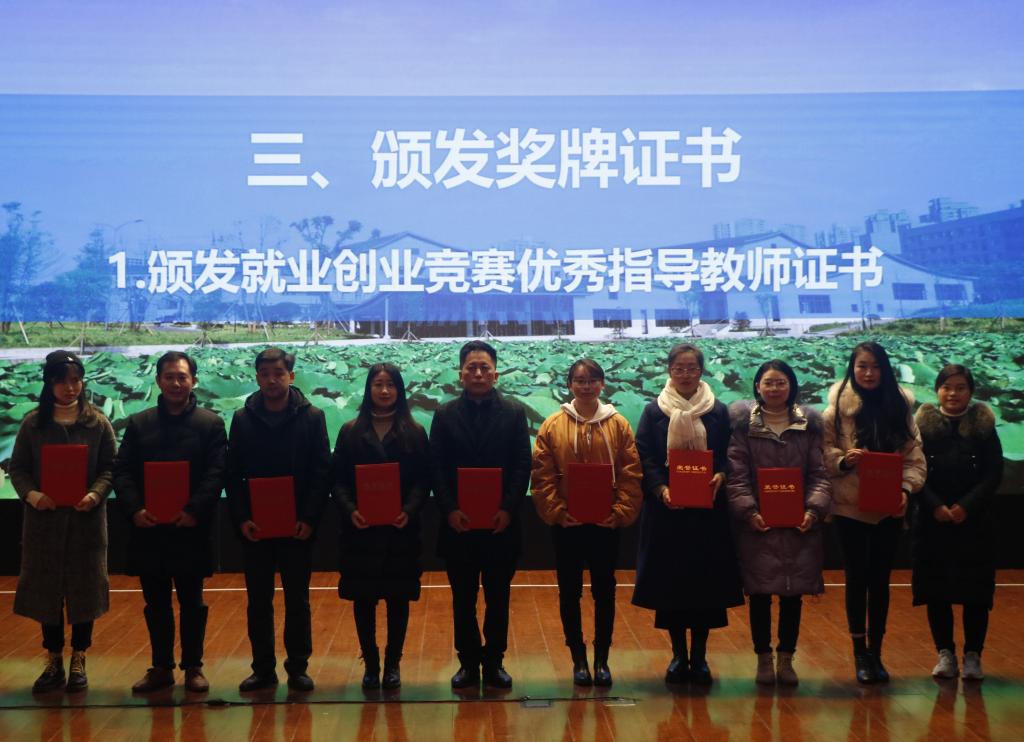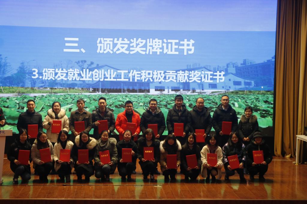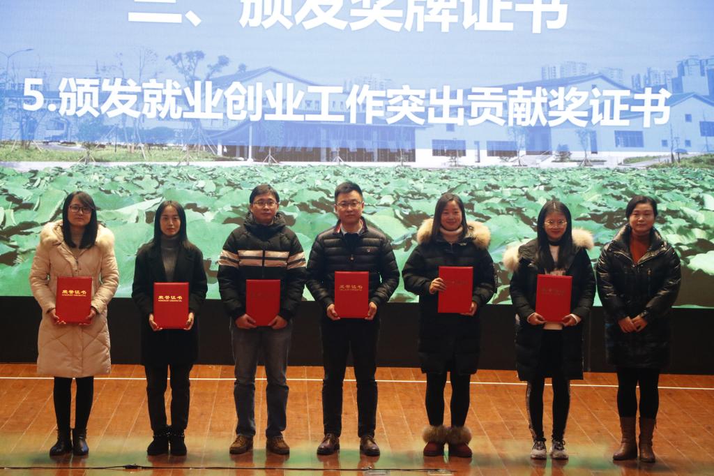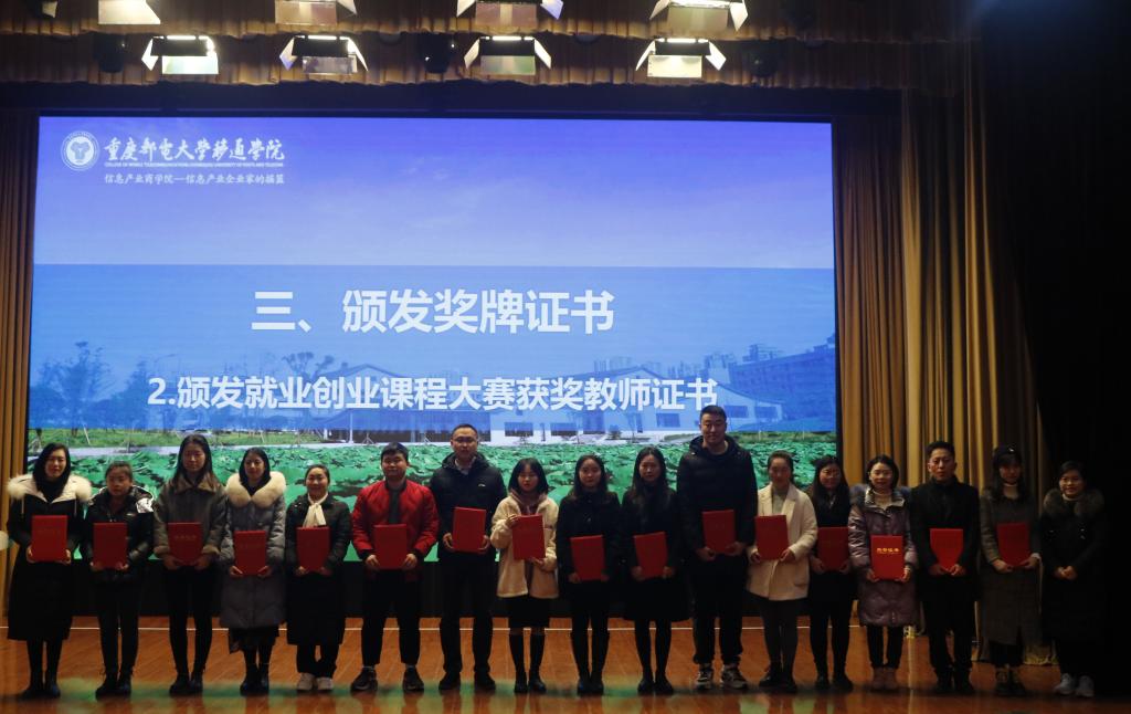 校长助理刘枚为郭淼等17人颁发就业创业竞赛优秀指导教师奖状、为张琼心等16人颁发就业创业课程大赛获奖教师奖状、为秦代辉等30人颁发就业创业工作积极贡献奖奖状。校长助理孙玺为李伟光等9人颁发就业创业工作先进个人奖状、为张平等6人颁发就业创业工作突出贡献奖奖状。校长张德民为淬炼商学院、智能工程学院和通信与物联网工程学院颁发就业创业工作先进集体奖牌。