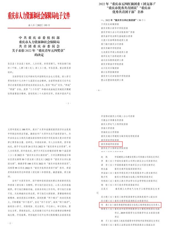 4月29日,重庆市人力资源和社会保障局、共青团重庆市委员会发布关于表彰2022年“重庆青年五四奖章”的决定。其中我校团委荣获2022年“重庆市五四红旗团委”,我校通信与信息工程学院学工副院长何燕荣获2022年“重庆市优秀共青团干部”,这是继2018年之后我校团委又一次获此殊荣。