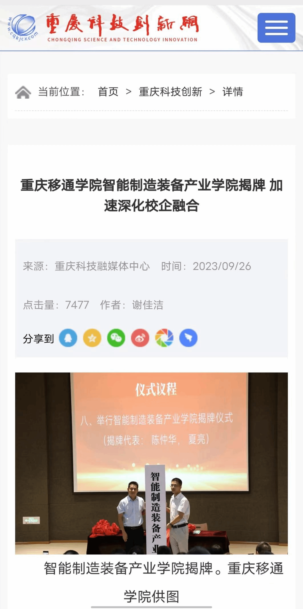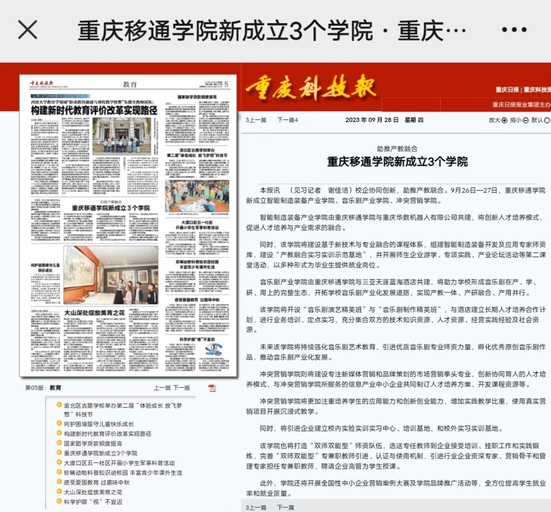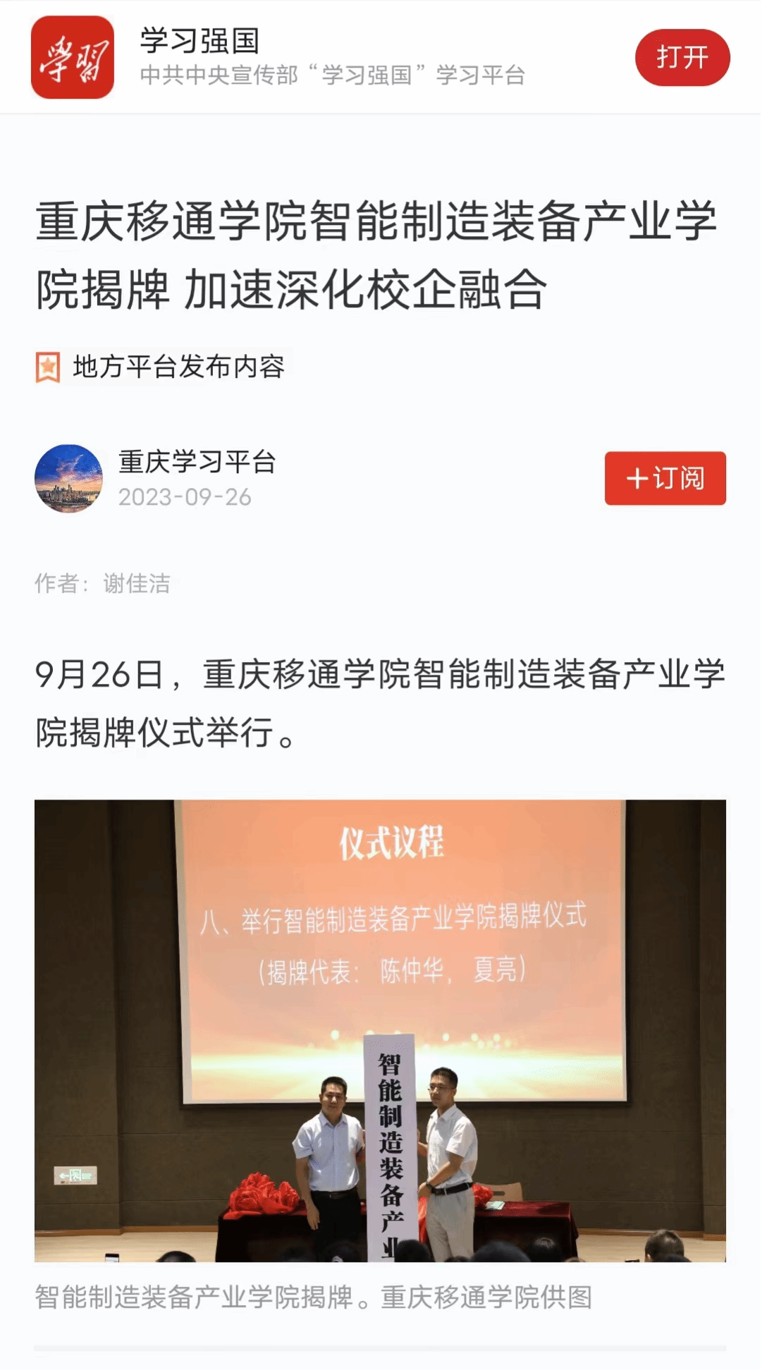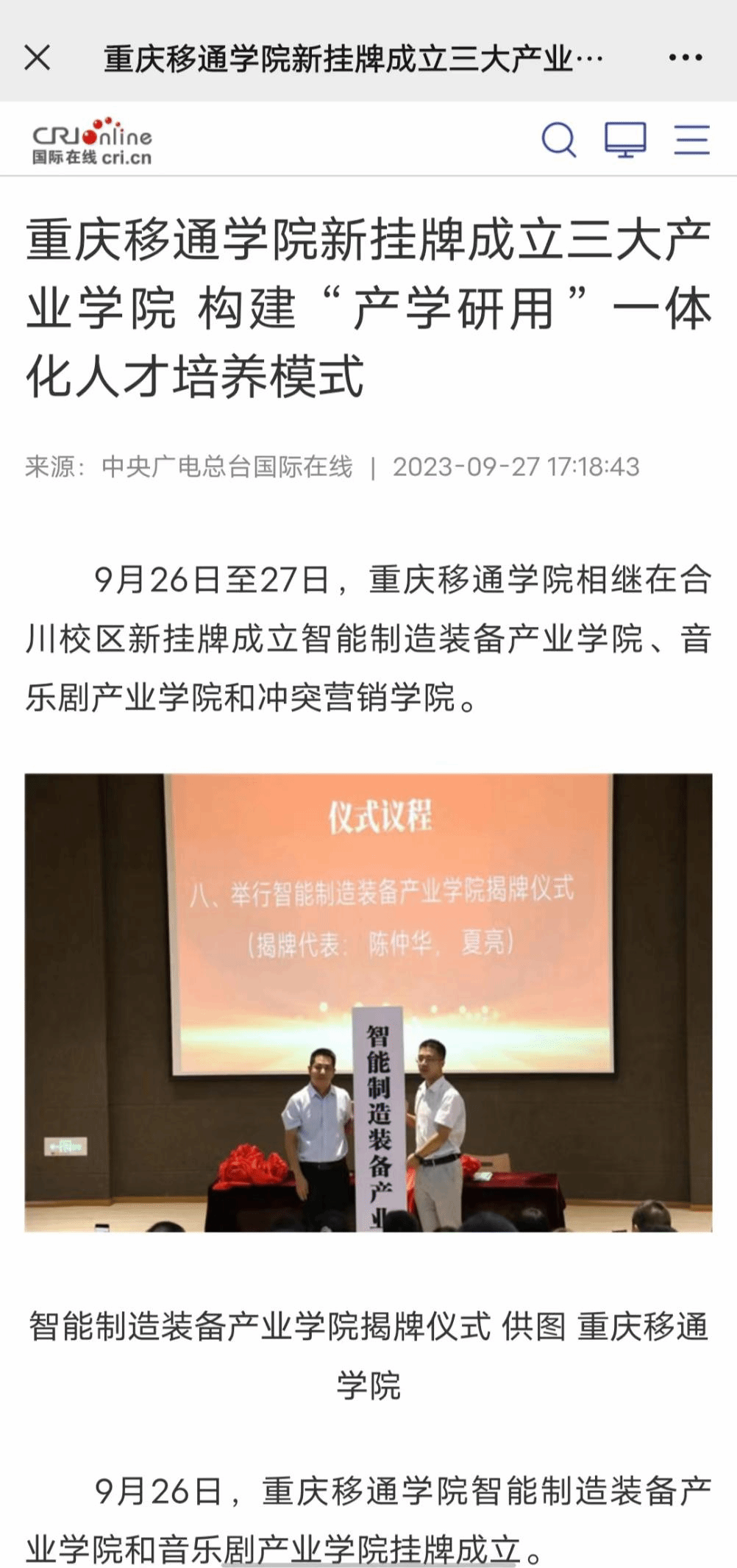 三大产业学院的成立,获得学习强国、中国教育在线、中新网、中央广播电视总台国际在线、商界、重庆科技融媒体中心、重庆科技报、重庆科技创新网等多家主权威、主流媒体关注报道。