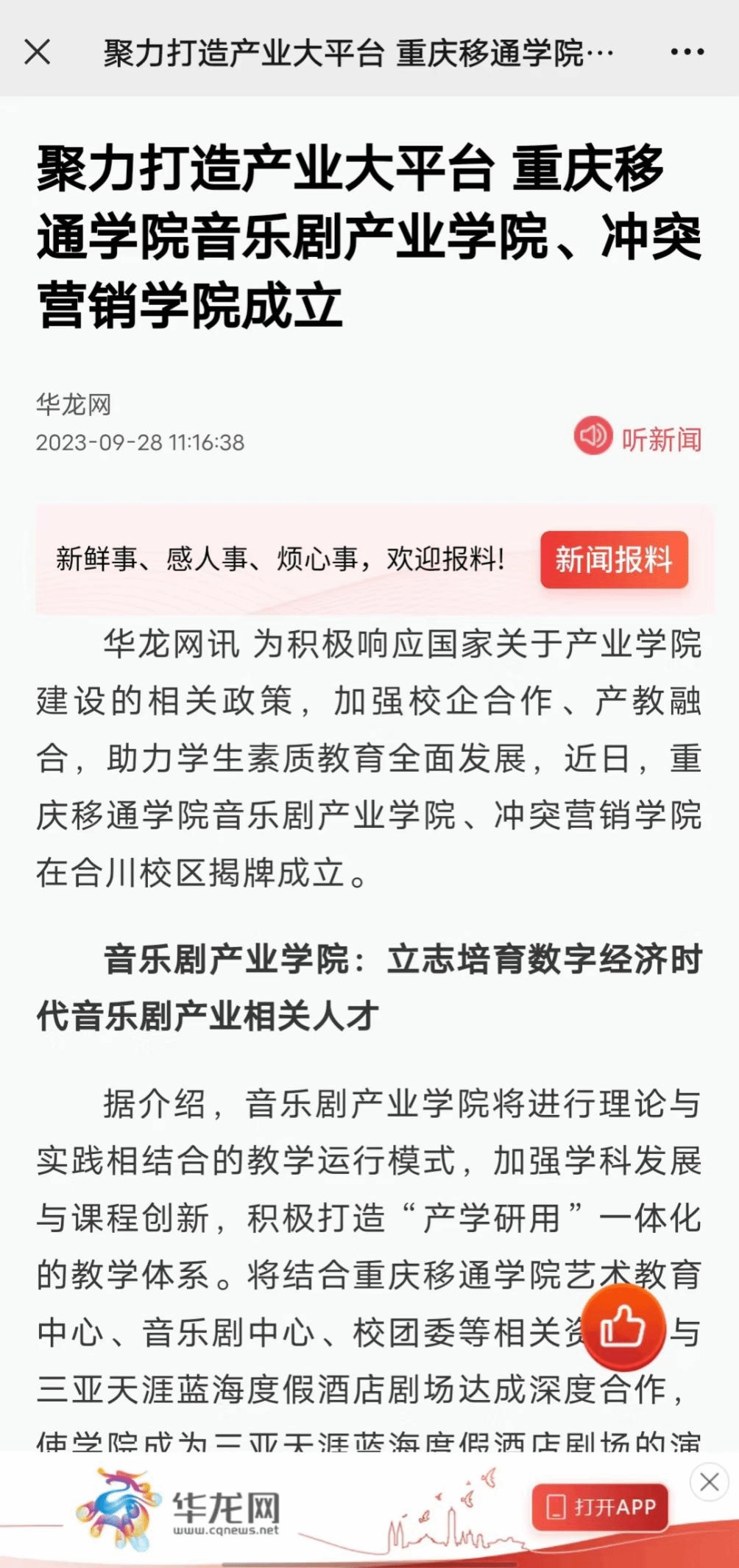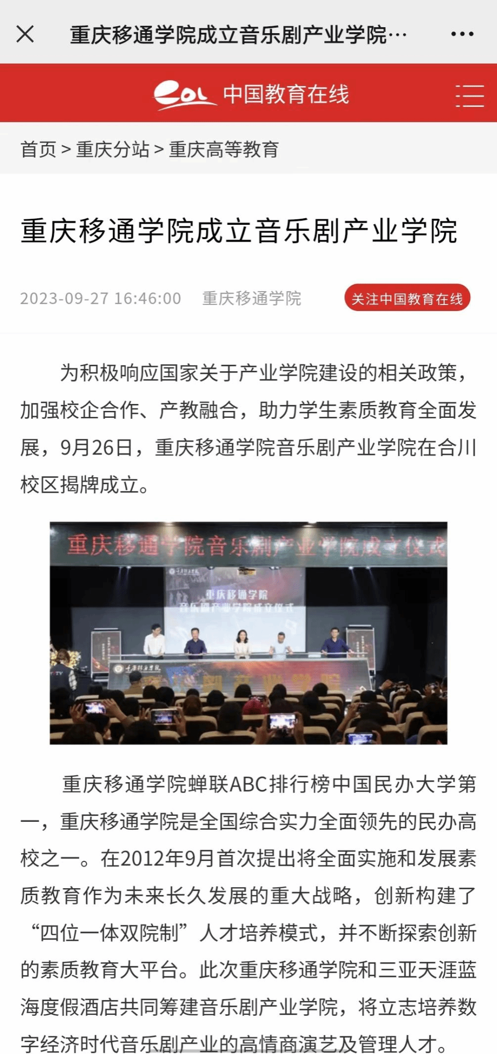 为积极响应国家关于产业学院建设的相关政策,深化学校“信息产业商学院”办学定位,培养适应和引领现代产业发展的数字经济时代高情商经营管理人才,作为“中国民办大学第一”,重庆移通学院加强校企合作、产教融合,助力学生素质教育全面发展。9月26日-27日,学校相继成立音乐剧产业学院、智能制造装.备产业学院、冲突营销学院。