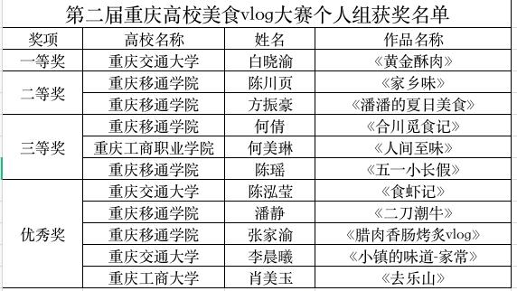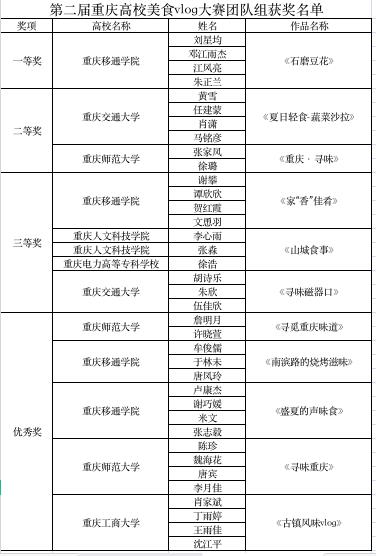 比赛启事一经发出,得到全市十余所高校学子的积极响应,40天的精心准备与紧张拍摄,重庆交通大学、重庆工商大学、重庆师范大学、重庆科技学院、长江师范学院、重庆第二师范学院、重庆人文科技学院、重庆工商职业学院、重庆传媒职业学院、重庆城市科技学院等十余所高校的参赛选手们把“生活”和“美食”相融合,把生活揉进镜头,制作出独属于自己一份“舌尖上的Vlog”,每部作品都有一段美丽的故事,每一个画面都是对美好生活的向往,每一帧都是一个美食风采展示。记录瞬间、记录生活,传递健康、传递幸福,这便是拍摄vlog视频的意义。