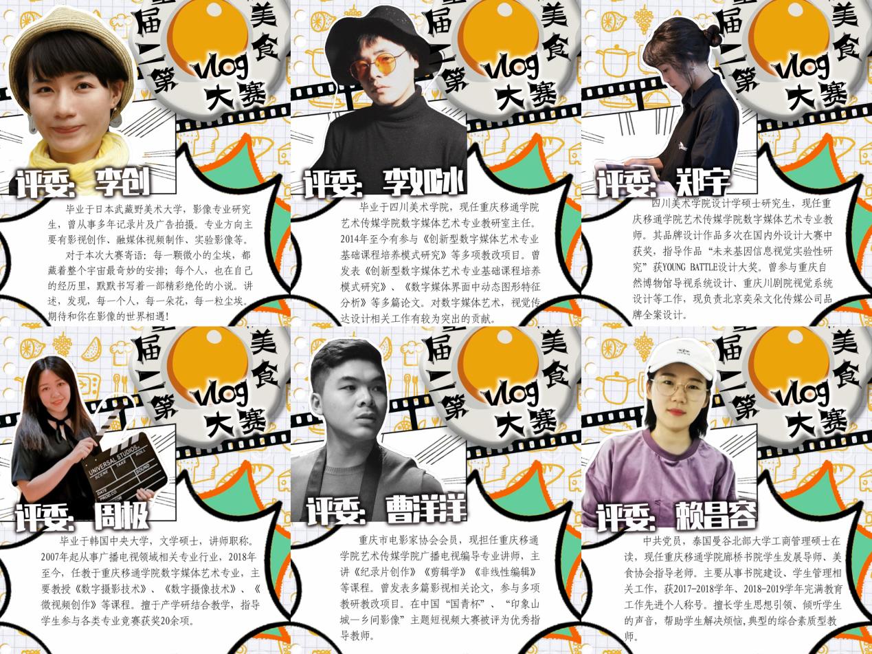 第二届重庆高校美食Vlog大赛总决赛评委,是由毕业于日本武藏野美术大学影像专业、现任重庆移通学院艺术传媒学院的李创老师以及其余五位专业老师组成,具备多元化特征,保证大赛评审团的专业性与公正性。评委通过对作品的表达、视频流畅度、构图的优美、主题的高度等多方面反复斟酌讨论,最终分别评选出团队组和个人组的一等奖1名、二等奖2名、三等奖3名、优秀奖5名。