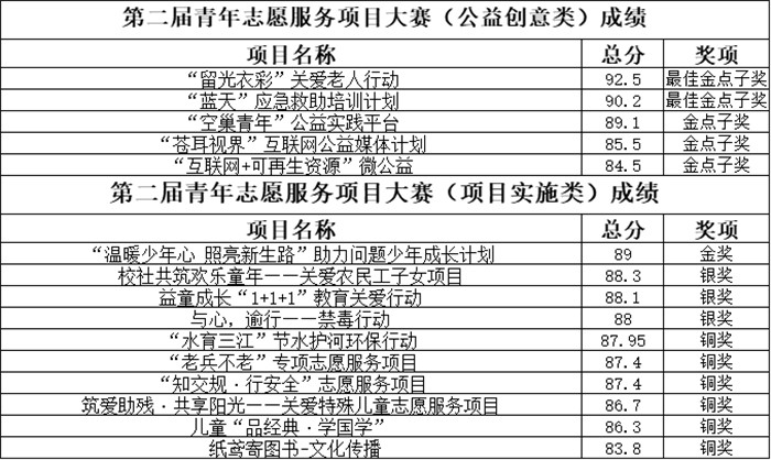 本次项目大赛加大对优秀项目的扶持力度,决赛产生的金奖、银奖和最佳金点子项目将给予1000—2000元的项目孵化基金并入驻项目孵化中心。自动化系、计算机科学系获得第二届青年志愿服务项目大赛优秀组织奖,通信与信息工程系获得公益创意专项赛优秀组织奖,现将各项目获奖情况公布如下:
