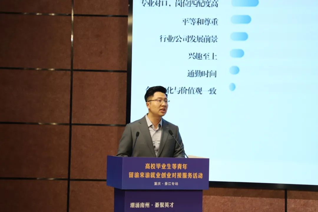 活动还邀请到重庆开拓卫星科技有限公司副总经理保玲,重庆双喜科技有限公司创始人刘杨靖进行“我在綦江的工作”主题分享,讲述各自在綦江的创业故事和创业心得。此外,奇妙村(重庆)农业有限公司董事长彭纯亮和重庆有研重冶新材料有限公司高级专务高翔为在场嘉宾领导和同学们分享了他们与綦江的缘分。重庆市就业创业专家库成员、重庆移通学院就业创业指导与服务中心副主任佘桂隆就当前就业形势、职业规划以及留渝就业政策展开分享。