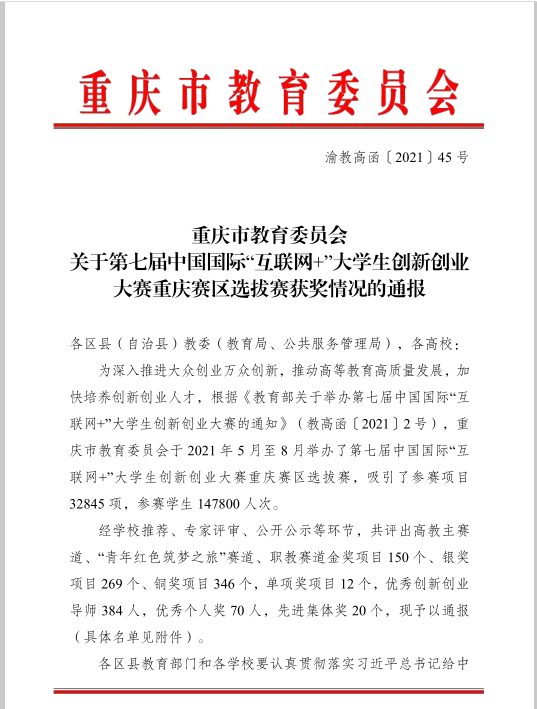 为深入推进大众创业、万众创新,推动高等教育高质量发展,加快培养创新创业人才,根据《教育部关于举办第七届中国国际“互联网+”大学生创新创业大赛的通知》(教高函〔2021〕2号),重庆市教育委员会于 5月至8月举办了第七届中国国际“互联网+”大学生创新创业大赛重庆赛区选拔赛,本届大赛共吸引了参赛项32845项,参赛学生147800人次。