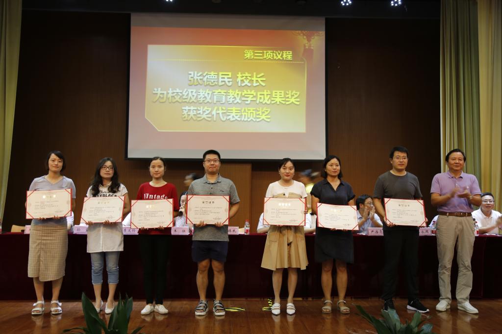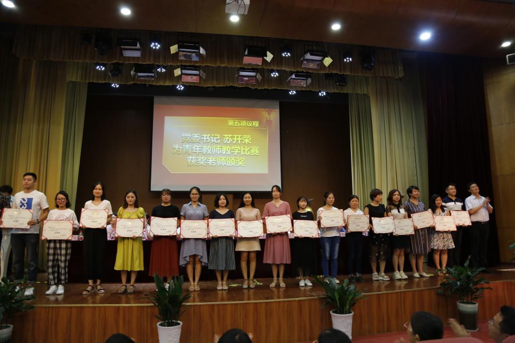 伴随着雄壮的国歌、温馨的暖场视频,大会正式拉开序幕。会上,校长助理刘枚宣读《重庆邮电大学移通学院关于公布2019年校级教育教学成果奖获奖名单的通知》,张德民校长为校级教育教学成果奖获奖代表颁奖。校长助理孙玺宣读《重庆邮电大学移通学院关于公布2019年青年教师教学竞赛获奖名单的通知》,苏开荣书记为青年教师教学比赛获奖老师颁奖。