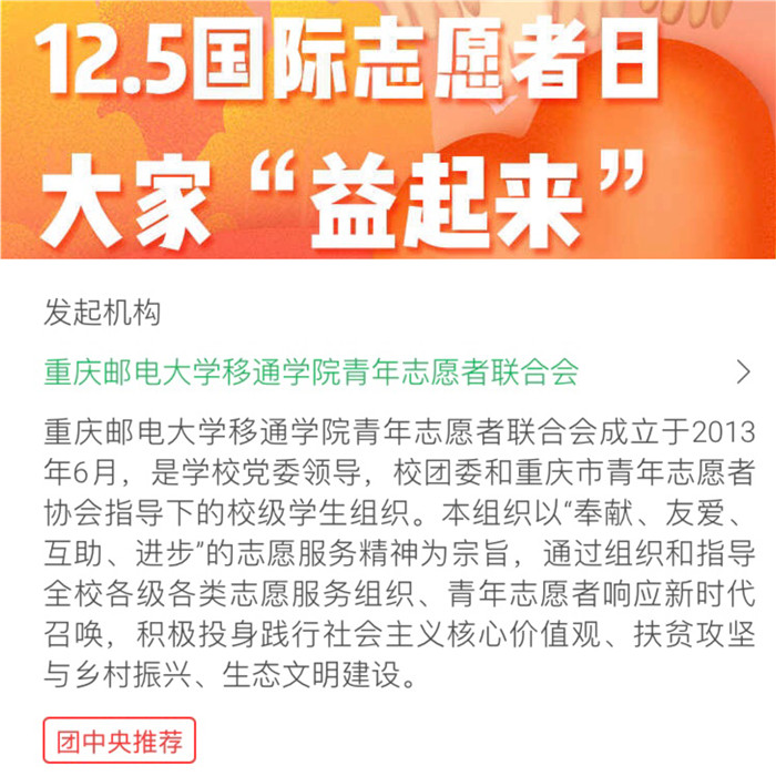 经团中央推荐,2018年8月,我校团委志愿服务模块负责人唐彬文老师与阿里巴巴签订公益三小时入驻协定,共建我校志愿服务线上阵地,青年志愿者联合会成为全国首批入驻公益3小时的高校志愿者组织,开始网络招募志愿者和发布活动。公众可以通过手机淘宝、支付宝搜索“3小时公益”可搜索到我校志愿服务活动,点击报名参加。在公益3小时全国考核中从全国近1000家高校、公益机构中脱颖而出,综合得分位列全国10强,志愿者满意度位居前三,并依托平台成功为山区儿童募集塑胶跑道操场1座。