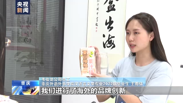 韦俊龙公司员工、重庆外语外事学院汉语言文学专业2022届毕业生王雨倩讲到:我们的产品像融入重庆合川的特色,进行了海外的品牌创新和年轻人喜欢的DIY设计,包括增加一些笔还有一些贴纸,让大家可以进行一些自由的选择,使我们产品的附加值提升了10倍。