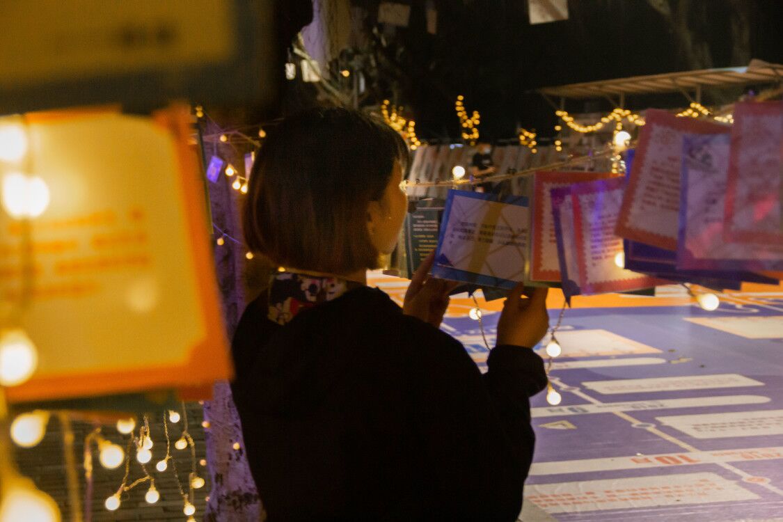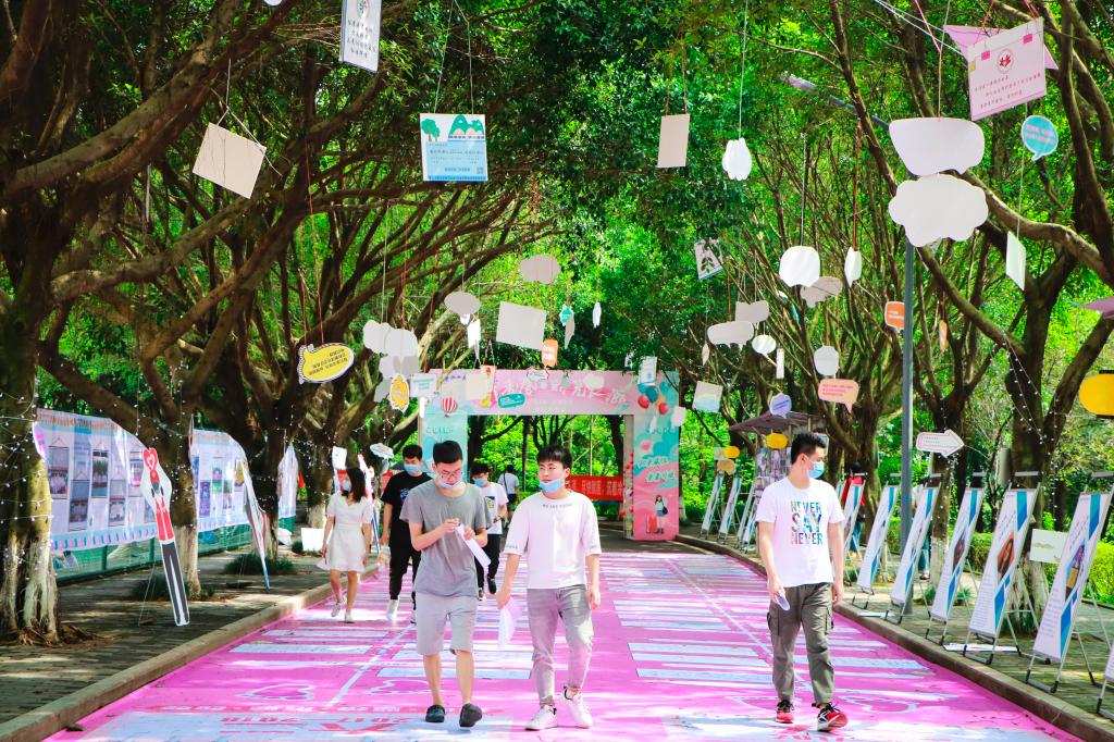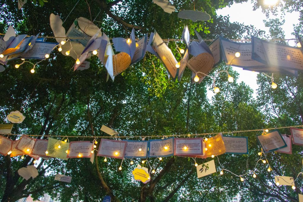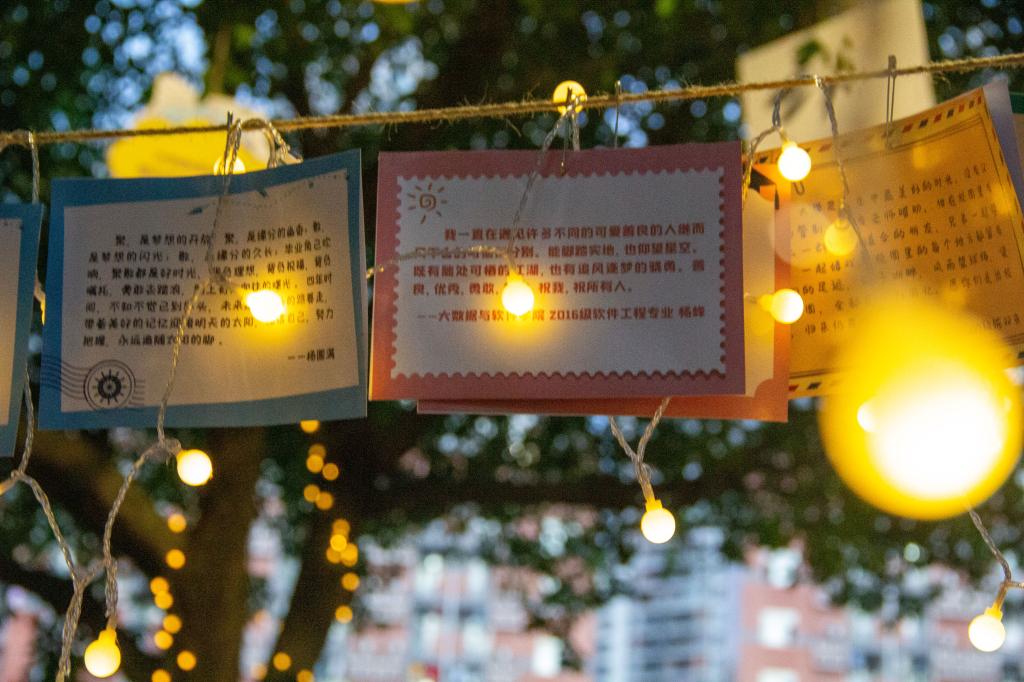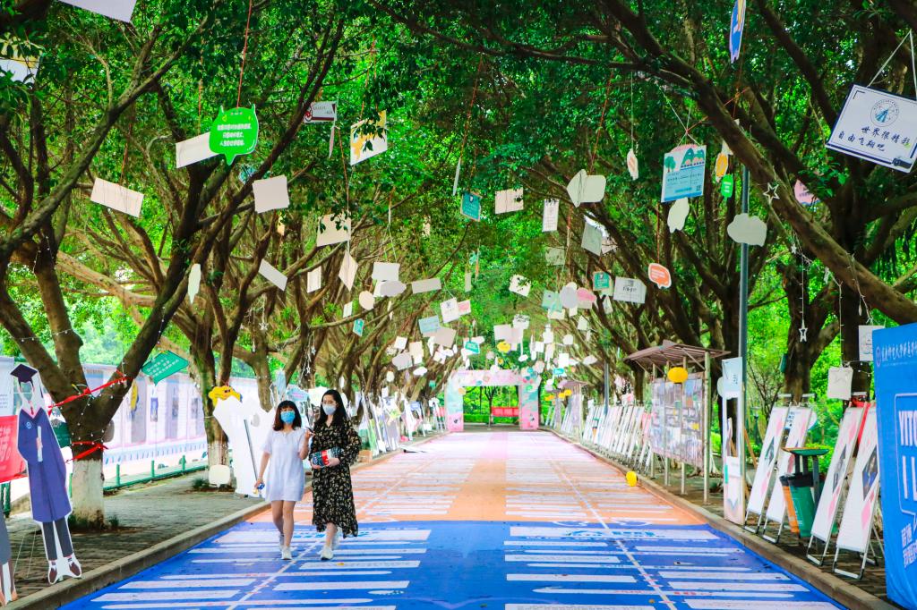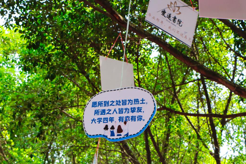 “只要是快乐的,付出就是值得的”“毕业是一段故事的结束,也是一段故事的开始”……除了地上的时光轴外,头顶树梢上也别有洞天。“空中心愿林”记录毕业生的心愿心语,多达上百块五颜六色的寄语牌高悬于树梢,每一块都有不同的寄语,内容或俏皮或暖心,犹如一个个风铃,在微风中静静飘扬,甚是浪漫温馨。