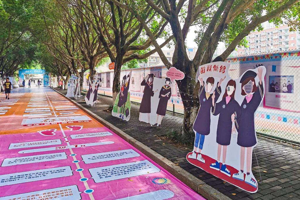安放在沿途道路两侧的各种拍照立牌成为了最佳打卡点,这些拍照立牌有宇航员、“抗疫”医务工作者、各种学士服卡通人物等多种形象,配以牵手、欢呼、奔跑等不同的姿态,让拍照的学子塑造出各种生动的造型。作为“时光长廊”参与性最强的项目,吸引大家纷纷拿出手机,驻足拍照留念,欢笑声此起彼伏。