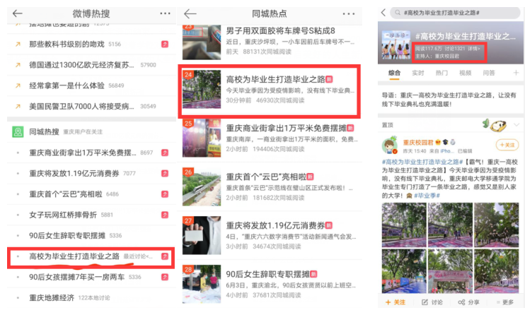 微博话题#高校为毕业生打造毕业路#两小时达到30万阅读量,截止目前,总阅读量达到118万。我校的“毕业生·移通辉煌路”上同城热搜了,再一次成为“别人家的大学!”
