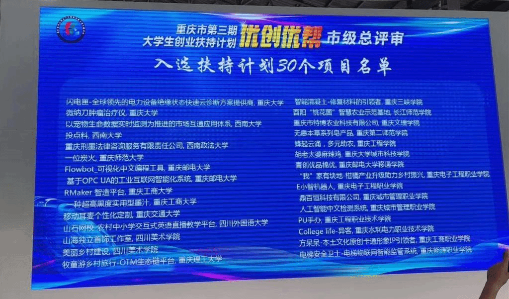 “青创优品棉优”项目,通过我校的选拔推荐、合川区片区的遴选、专家组实地考察等环节的层层考核,被确定为重庆市第三期“优创优帮”大学生创业扶持计划50强,而在此次总评审现场中,“青创优品棉优”项目通过1分钟项目综述+1分钟诉求表达+1分钟导师考评提问等环节的现场答辩成绩,和结合实地考察所了解掌握情况对项目进行的综合考评中入选了重庆市第三期“优创优帮”大学生创业扶持计划30强。