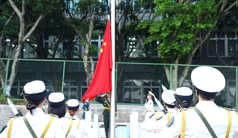 开学典礼在庄严的国歌声中拉开序幕,全体师生肃立。