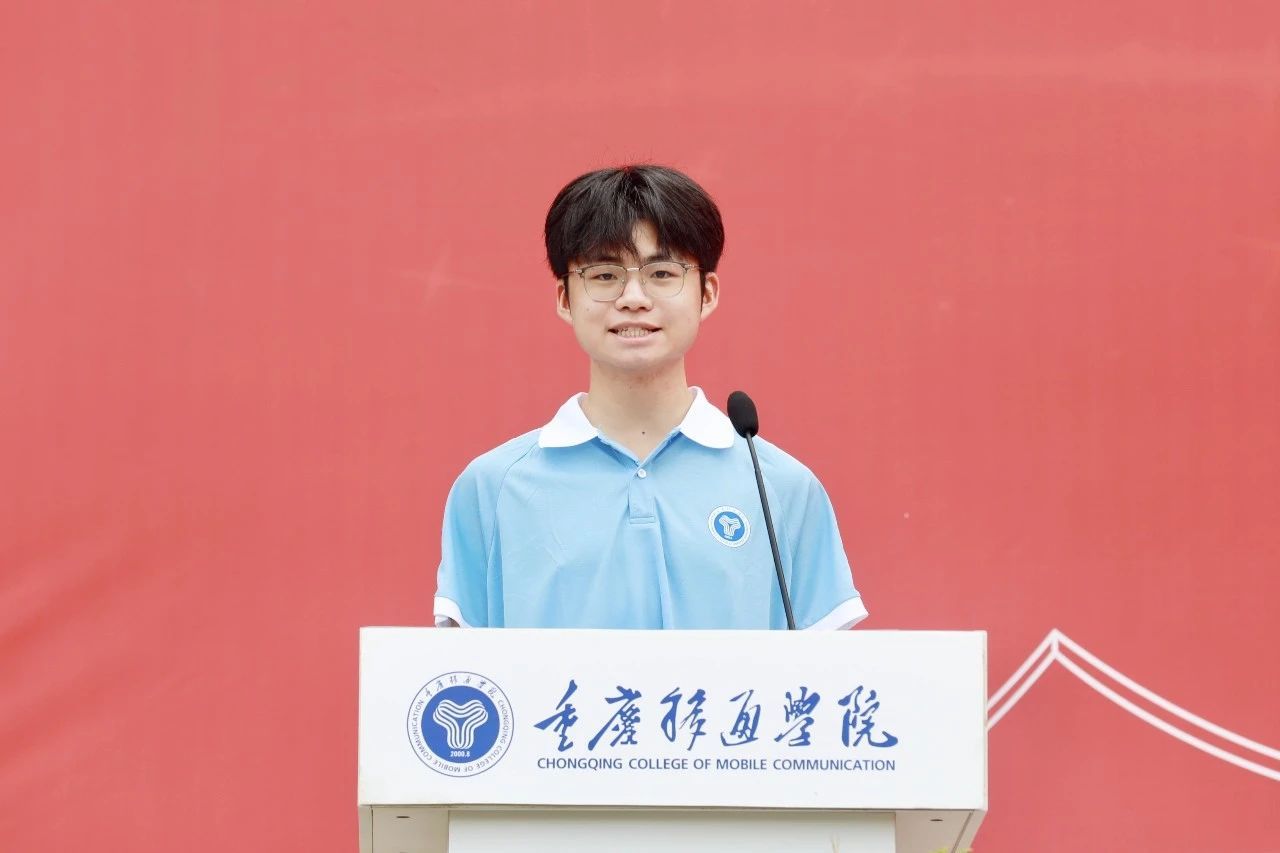 合川校区新生代表,来自艺术传媒学院、南湖书院的2024级网络与新媒体专业洪华铠发言。他代表全体新生向辛勤的老师们和志愿者表达深深敬意与感谢,并分享了自己对大学生活的期待与梦想。他号召同学们在大学四年中要脚踏实地、勤奋学习,团结友爱,锤炼品格,并关注身心健康,全面发展,以期成为具有理想信念、专业素养和社会责任的移通人,在大学不负韶华,肆意生长。