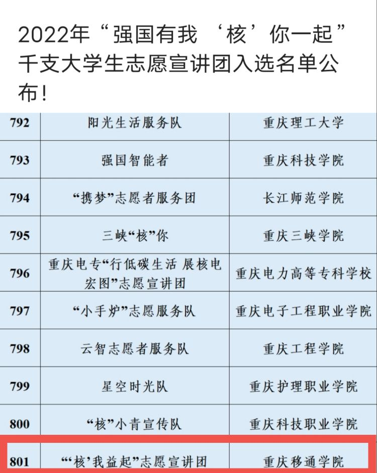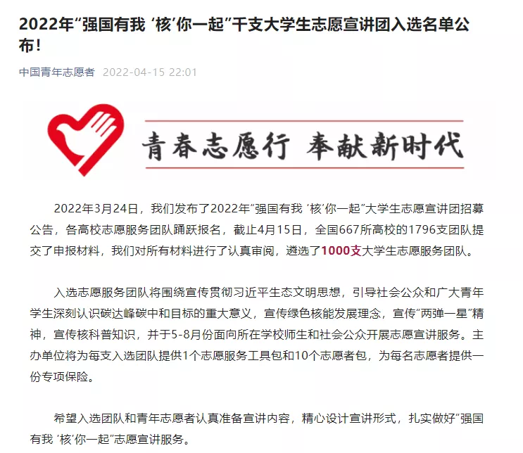 3月24日,中国青年志愿者协会发布2022“强国有我‘核’你一起”大学生志愿宣讲团招募,经材料审核等环节,我校“核”我益起志愿宣讲团从全国1796支队伍中成功通过遴选,入选2022年“强国有我‘核’你一起”大学生志愿宣讲团。