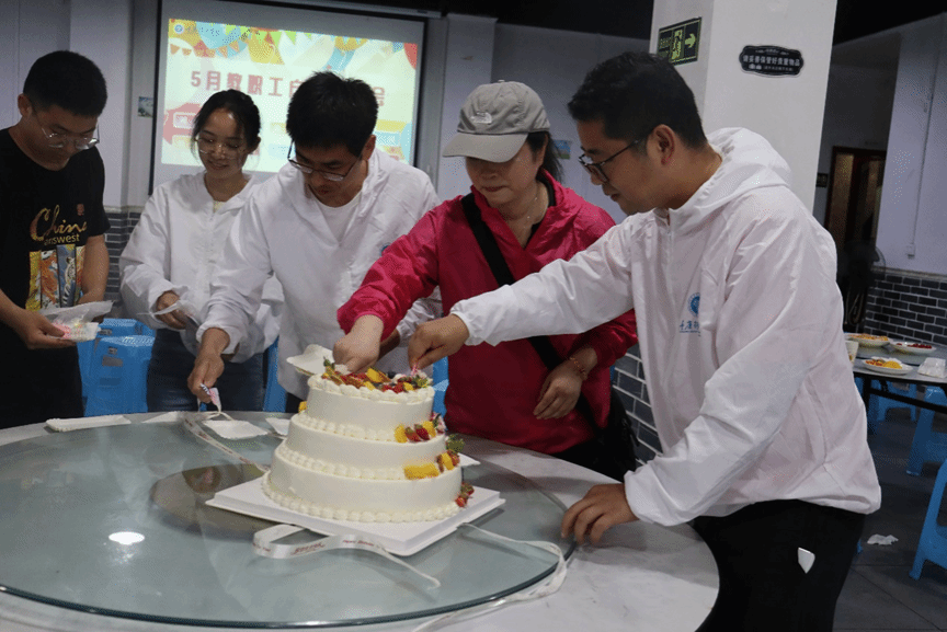 活动最后,由常务副校长王永周、副校长孙玺共同切蛋糕,为5月生日的教职工送上惊喜和祝福。