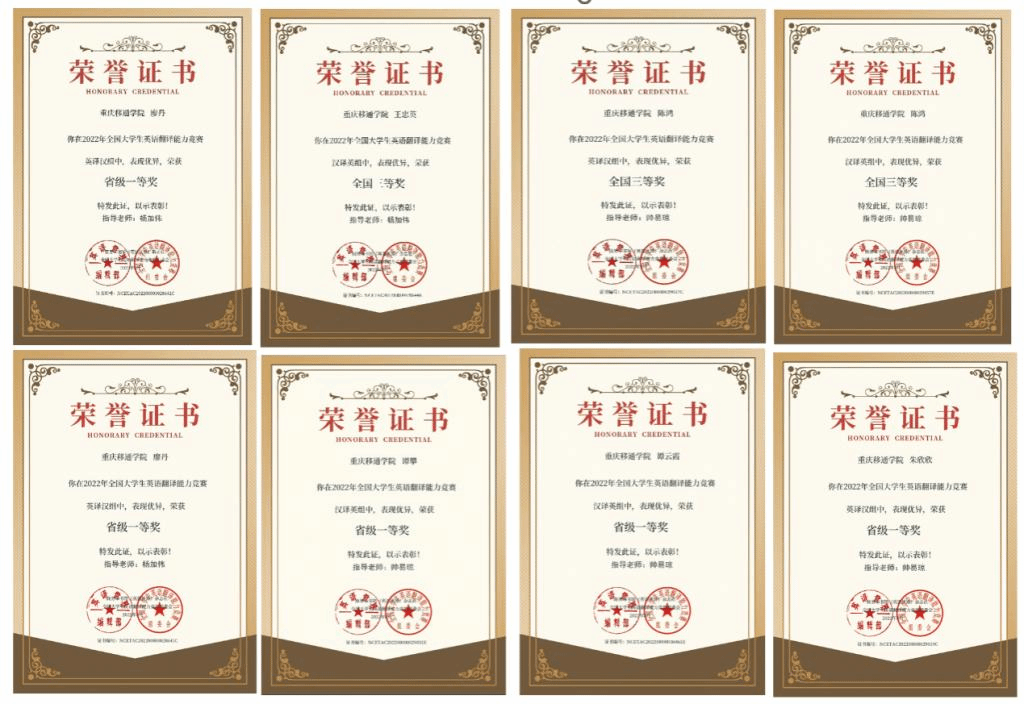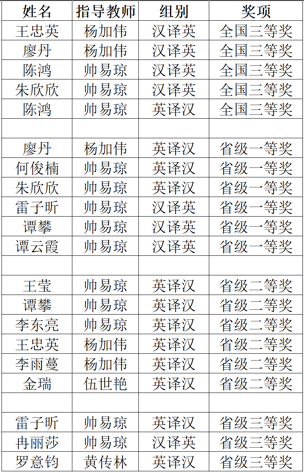 为贯彻落实教育部《关于加快建设高水平本科教育全面提高人才培养能力的意见》等文件精神,激发大学生英语学习的兴趣,促进大学生英语翻译能力发展,为全国在校大学生提供展示英语翻译水平和能力运用的舞台,商务印书馆直属《英语世界》杂志社于今年3-8月举办了2022年全国大学生英语翻译能力竞赛。我校外国语学院教师积极响应,动员并组织学生报名参赛。最终我校5人次获全国三等奖,6人次获省级一等奖,6人次获省级二等奖,3人次获省级三等奖。