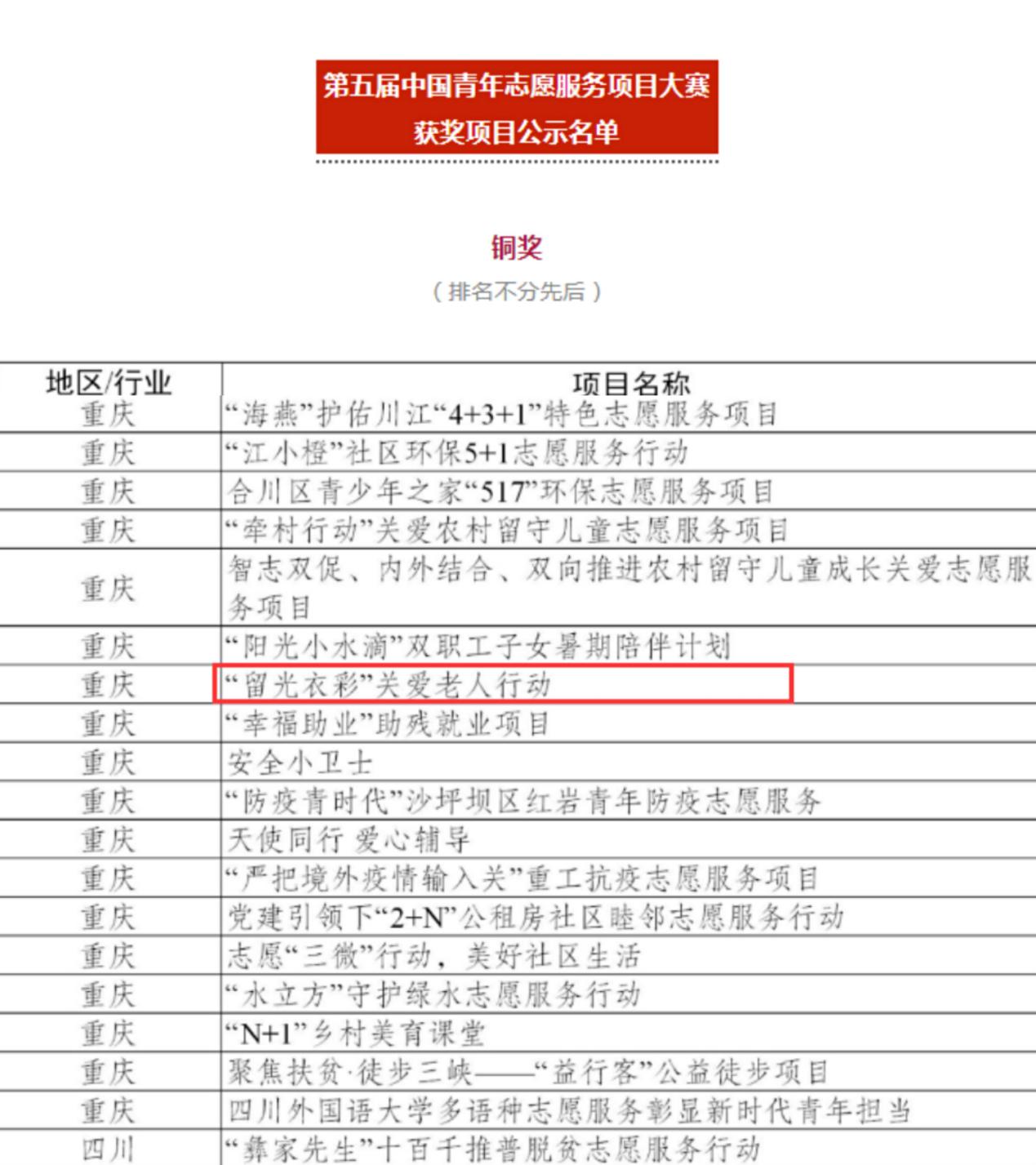11月26日,中国青年志愿者协会公示了第五届中国青年志愿服务项目大赛全国赛获奖名单,我校“‘留光衣彩’关爱老人行动”项目荣获第五届中国青年志愿服务项目大赛铜奖。