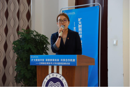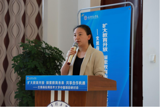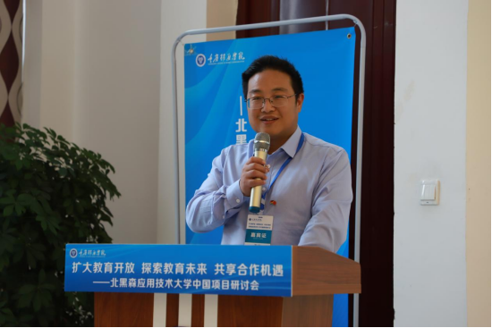 中德应用技术学院副院长侯宇晶对我校中德应用技术学院办学情况以及教学成果等基本情况做简单汇报后,从多元课程研发,双校园无缝衔接、多重导师指导,全方位个性定制、多维互助学习,高效率共同发展、助教全程协作,1:1卓越教学、多样感恩机制,强动力稳健成长、特色双院活动,博众长联动融合、六个方面就我校与北黑森应用技术大学合作的情况做了工作总结。