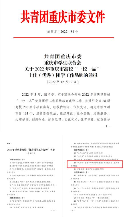 12月19日,按照《重庆市高校“一校一品”优秀团学工作品牌培育建设管理办法(修订)》的相关规定,由有关机关、企事业单位、研究机构等各领域专家组成的评审组完成终审,我校“双院制背景下高校劳动教育多元实践平台”系列活动经历层层遴选,荣获2022年重庆市高校“优秀团学工作品牌”荣誉,向全市高校展示了我校劳动教育阶段性成果。