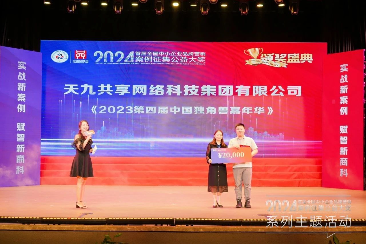 天九共享网络科技集团有限公司案例《2023第四届中国独角兽嘉年华》获评最佳视频奖,全国品牌社团组织联席会副秘书长王红君为其颁奖。