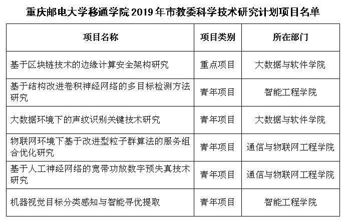 近日,重庆市教委下达了2019年度市教委科学技术研究计划项目,我校申报的《基于区块链技术的边缘计算安全架构研究》获批重点项目,《基于结构改进卷积神经网络的多目标检测方法研究》等5个项目获批青年项目。